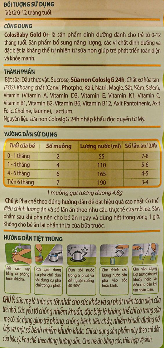Chý ý: Pha sữa Colosbaby 0+ theo đúng hướng dẫn dể đạt hiệu quả cao nhất. Có thể điều chỉnh lượng ăn và số lần ăn theo nhu cầu thực tế của mỗi bé. Sản phẩm sau khi pha nên cho bé ăn ngay và ùng hết trong vòng 1 giờ. Không cho bé ăn lại phần thừa sau pha quá 1 giờ.