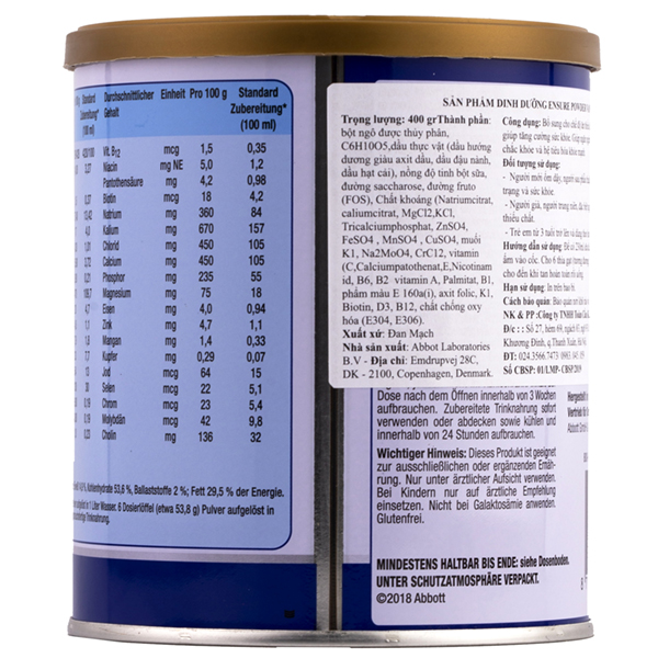 Sữa Ensure Đức 400g được sản xuất bởi hãng Abbott dành riêng cho thị trường Đức. Sữa cao năng lượng, giàu Protein, Vitamin và khoáng chất giúp bồi bổ cơ thể. Dùng được cho mọi đối tượng bắt đầu từ trẻ lên 3 đặc biệt cần thiết cho người cao tuổi, người gầy, người suy dinh dưỡng, người ốm bệnh hoặc sau phẫu thuật.Trong một ly sữa Ensure Đức 250ml pha chuẩn giúp bổ sung 250Kcal là nguồn năng lượng tuyệt vời mà không phải dòng sữa nào cũng có được. Chính vì vậy mà chưa có bất kỳ sản phẩm nào có thể thay thế được Ensure về công dụng tuyệt vời này.