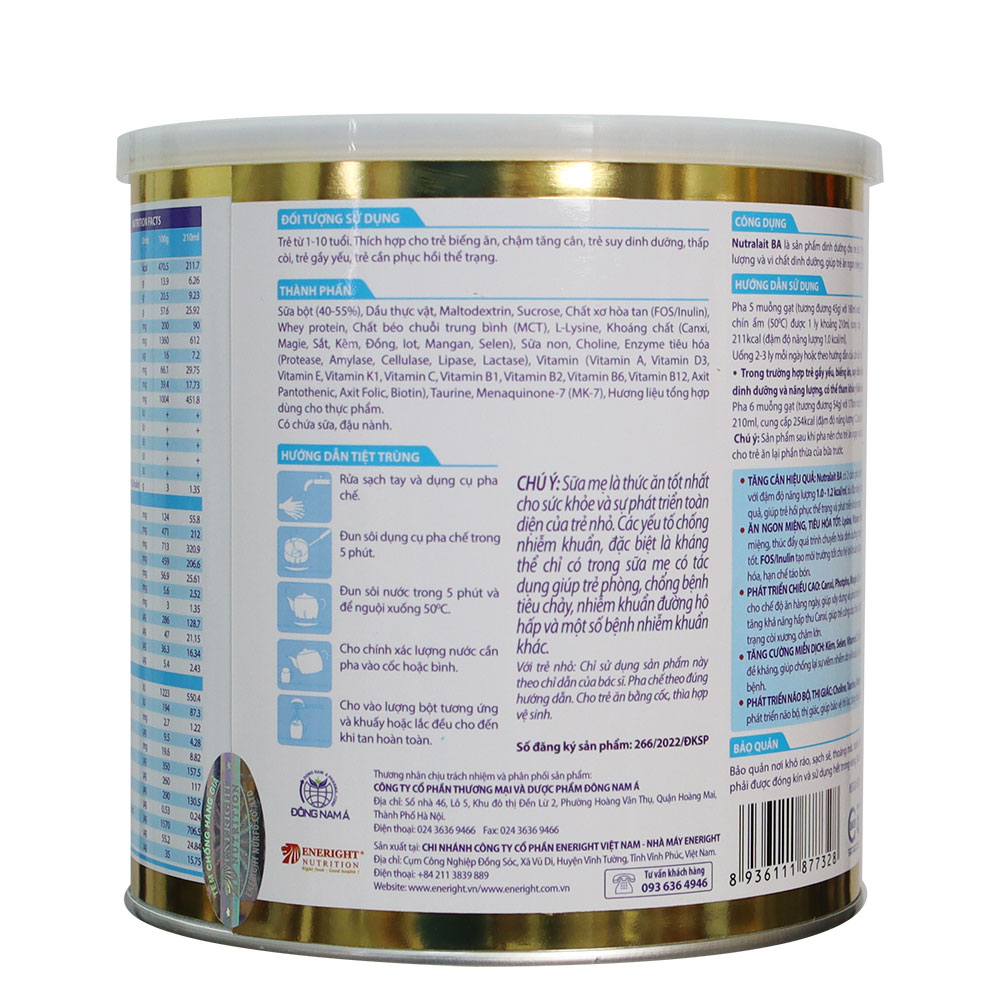 Sữa Nutralait BA là sản phẩm dinh dưỡng cho trẻ từ 1-10 tuổi. Sản phẩm bổ sung năng lượng và vi chất dinh dưỡng, giúp trẻ ăn ngon miệng tăng cân hiệu quả, phát triển chiều cao, não bộ, thị giác, tăng cường hệ miễn dịch và phát triển khỏe mạnh